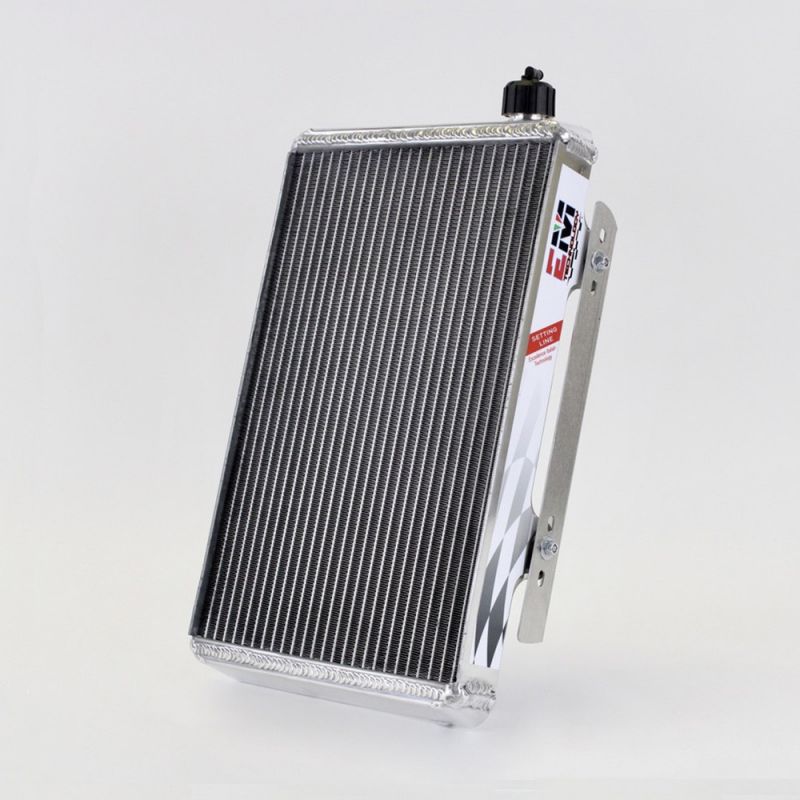 The EM-09 PRO complies with the ROK regulations for the ROK DVS and Shifter ROK categories. Compared to the EM-09 model, it differs in a special radiant core with a close internal tube pitch, designed to increase cooling performance. The EM-09 PRO radiator ensures optimal year-round cooling for the ROK DVS, Shifter ROK and KZ categories. For the single-speed categories, it is recommended to use it only in the summer, with high temperatures. The excellent cooling capacities, due to the special radiant core, are further enhanced by the water inlet and outlet trays with an inclined design. The solution increases the surface area in contact with the air, eliminating the formation of hot water bubbles. The special radiant core, compared to the radiator structure, is recessed, creating a sort of conveyor that increases air intake at high speeds and improves cooling. Particular attention has also been paid to the water outlet fitting, positioned to increase the water flow rate and prevent the silicone hose from touching the curbs. The radiator has an integrated deflector.