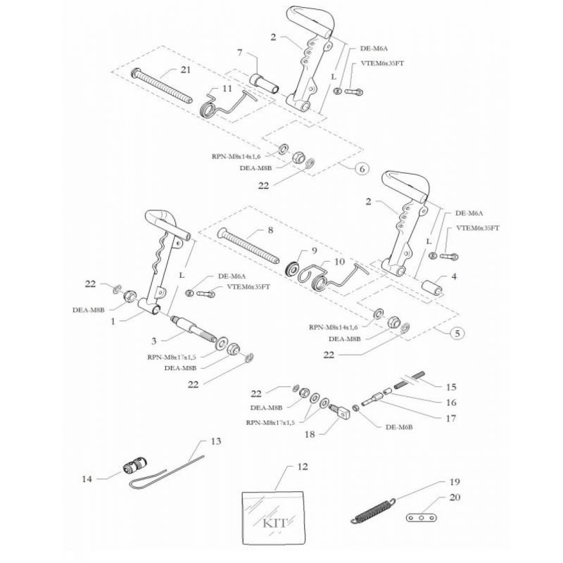 THE KIT INCLUDES: - 02 SCREW VSPM8X90U NO.8 ON THE FIGURE - 02 PEDAL SPRING RETAINER ROSETTE N.7 ON THE FIGURE - 01 ACCELERATOR PEDAL RETURN SPRING N.6 ON THE FIGURE - 01 BRAKE PEDAL RETURN SPRING N.6 ON THE FIGURE - 02 RPN-M8X14X1.6 - 02 DEA-M8B - 02 RETAINING RING 3,1X1X1 N.10 ON THE FIGURE