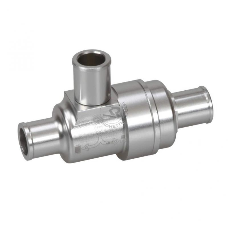 3-way thermostatic valve with natural anodized 45°C. This thermostatic valve, unlike most currently on the market, is built specifically for kart engines. The internal valve is calibrated to open at 45°C. No thermostatic valve on the market, coming from the motorcycle sector, opens at such a low temperature. Righetti Ridolfi had these internal valves built to technical specifications for kart engines, completing the product with an aluminum body machined by CNC machining.