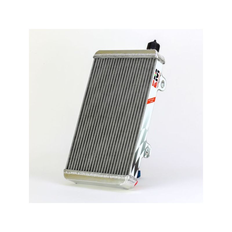 Kart radiator complete with support Radiator built entirely by hand by highly qualified personnel, tig welded and mirror polished. The radiator is supplied with adjustable billet aluminium connections. The EM-01 model is suitable for all seasons and the curtain can be mounted as an accessory.