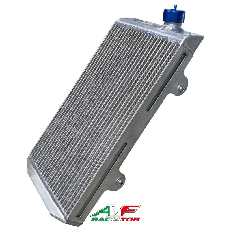 AF Go Kart TWENTY-1 Standard "Blue Edition" radiator. The Twenty-1 Standard model is recommended in the mid-seasons when temperatures have a large range but not high. The TWENTY-1 Edition is the result of the excellent experience of the GOLD Edition, which we have tried to improve by creating the inclined profile of the upper bowl, in order to reduce air resistance while maintaining excellent cooling characteristics Years of experience in the industry have allowed us to develop this revolutionary product. This is an innovation compared to previous models in all respects. The volume is calculated to achieve maximum performance in all weather conditions. The technology of the Twenty-1 line, thanks to its internal structure, retains water for longer. This significantly improves efficiency by lowering the coolant outlet temperature by 2° centigrade higher than traditional radiators The quality of the aluminum used in the construction of the mass of the AF go kart Twenty-1 Standard radiator has been carefully chosen to improve the resistance of the slats to impacts and increase their longevity. The anchors for the supports are molded together with the radiator structure. TIG welds are additional measures for greater stability and resistance to stress. Like all the radiators in this line, the AF go kart Twenty-1 Standard radiator mounts belong to the Blue Edition racing range, whose architecture has been finely studied over the years and are equipped with silent blocks, and in this version they are blue. To ensure that the Blue Edition cap is also able to dissipate heat, it is made of billet aluminum by CNC numerical control machinery to obtain maximum machining precision, which is also blue in color. All these features allow this model to be a point of reference for all categories, both single-speed and non-single-speed.